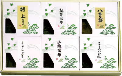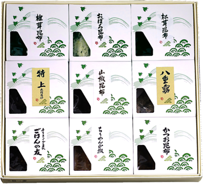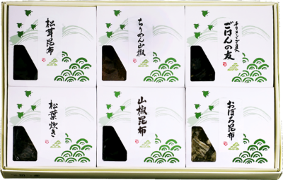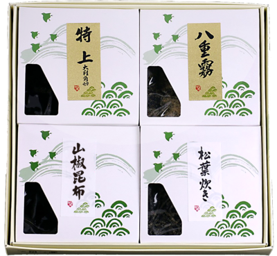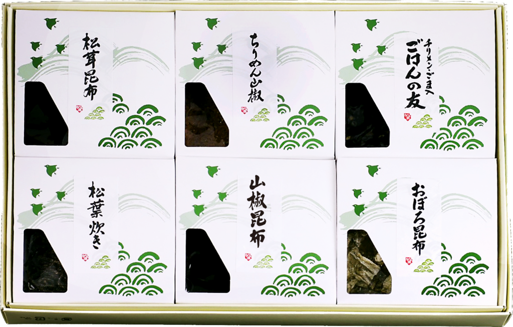 贈答用佃煮昆布 素材の良さを引き出すために、製法にもこだわりました。 山海の珍味が育てた品々をご賞味ください。 松茸佃煮詰合せ 御進物好適品! KN-100 松茸佃煮詰合せ(9品) 松茸昆布・八重霧・かつお昆布 薫風の潮×2・松茸佃煮 山椒昆布・特上・ちりめん山椒 横31.5cm×縦31.5cm マチ3cm 10,584円(税込) カートへ KN-70 松茸佃煮詰合せ(6品) 松茸昆布・松茸佃煮・ちりめん山椒 八重霧・薫風の潮・特上 横31.5cm×縦22cm マチ3cm 7,560円(税込) カートへ KA-48 松茸佃煮詰合せ(9品) 椎茸昆布・おぼろ昆布・松茸昆布 特上昆布・山椒昆布・八重霧 ごはんの友・ちりめん山椒・かつお昆布 横31.5cm×縦31.5cm マチ3cm 5,184円(税込) カートへ KA-39松茸佃煮詰合せ(6品) 特上昆布・松茸昆布・八重霧 きゃらぶき・山椒昆布・ちりめん山椒 横31.5cm×縦22cm マチ3cm 4,212円(税込) カートへ KA-29松茸佃煮詰合せ(6品) 松茸昆布・ちりめん山椒・ごはんの友 松葉炊き・山椒昆布・おぼろ昆布 横31.5cm×縦22cm マチ3cm 3,132円(税込) カートへ KA-25佃煮詰合せ(4品) 特上昆布・八重霧 山椒昆布・松葉炊き 横22cm×縦21.5cm マチ3cm 2,700円(税込) カートへ KA-20(4品) 松茸しぐれ・ちりめん山椒 松葉炊き・椎茸昆布 横22cm×縦21.5cm マチ3cm 2,160円(税込) カートへ KA-15(3品) ちりめん山椒・松茸昆布・松葉炊き 横31.5cm×縦11.5cm マチ3cm 1,620円(税込) カートへ KA-10(2品) 山椒昆布・きゃらぶき 横21.5cm×縦11.5cm マチ3cm 1,080円(税込) カートへ KB-10(2品) 松茸昆布・ちりめん山椒 横21.5cm×縦11.5cm マチ3cm 1,080円(税込) カートへ 2025年10月8日